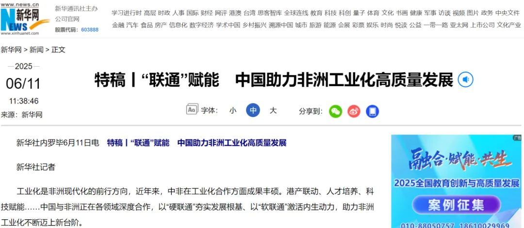 6月11日,正值中非合作论坛成果落实协调人部长级会议在长沙举行之际,新华网发布特稿《“联通”赋能 中国助力非洲工业化高质量发展》,特别点赞温州职业技术学院联合多家国内高职院校及企业共建的安中工程技术学院。作为中国“职教出海”项目之一,安中工程技术学院成为中非产能合作的人才枢纽,为非洲工业化注入中国职教力量。