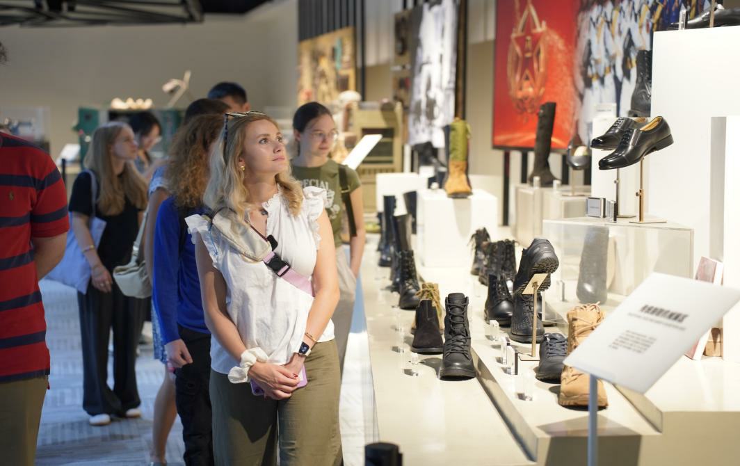 了解了“温州四区”的中文表述后,学员们实地探访温州龙头企业——红蜻蜓鞋业有限公司及其鞋业博物馆,在跨越七个朝代、绵延五千年的鞋履珍品中,感受中国鞋文化的演变脉络。在企业的品牌馆与科技馆的透明工坊内,学员们认真观察工匠们的制作过程与现代化生产手段,加深对温州特色鞋产业的内涵理解;在校内现代化工坊,教师指导学员们借助数字孪生实训平台,操作激光设备投入皮革切割实战。从软件设计图案到激光精准切割、修边打孔,学员们屏息凝神,感受皮革的天然肌理与现代科技的精密融合。