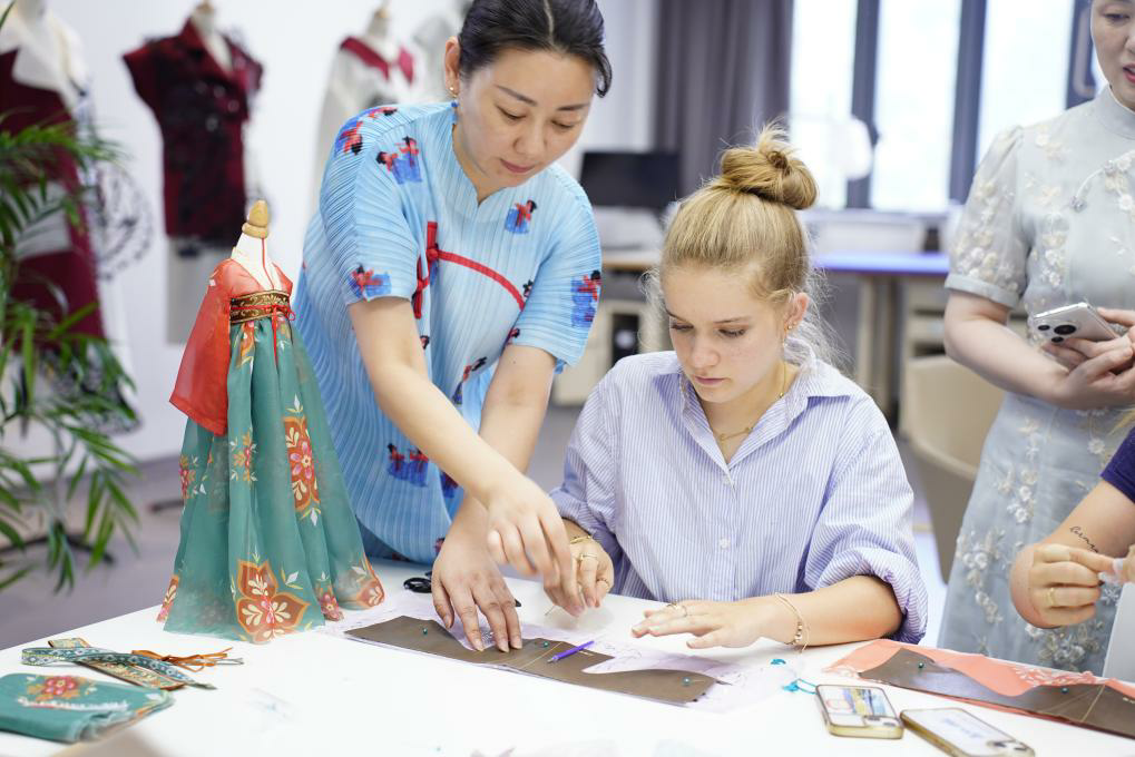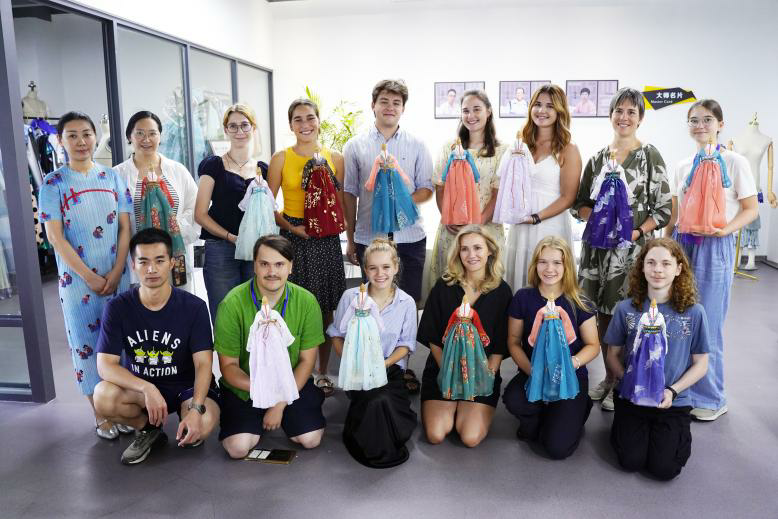 项目开设了中国传统服饰文化专题课程及“蓝染”“螺钿工艺”“汉服立裁”等主题实训工坊,学员们深入学习基本操作汉语标语与“量体裁衣”等实用性词组表达,结合实物理解服饰与形制中的文化意蕴,体悟“无规之规”的中式美学与“精雕细琢”的匠人情怀,并亲手制作发簪、蓝染方巾等,将东方之美物我相融。