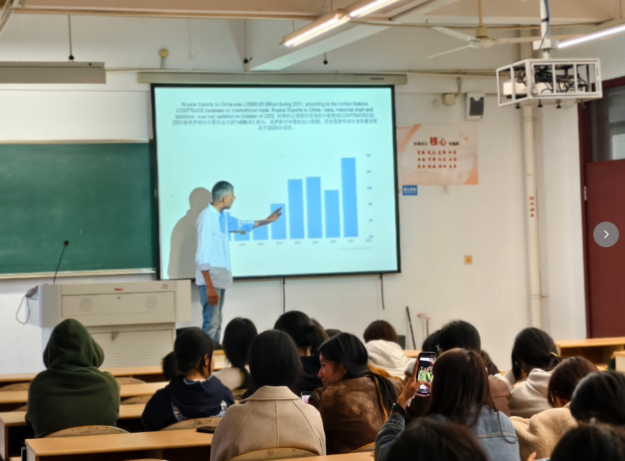 11月12日,数字经贸学院特邀温州大学商学院外籍教师Uddin老师,为大数据与会计专业学生带来“俄罗斯与中华人民共和国的跨境贸易关系(原油)”专题讲座,以国际视野搭建理论与实务桥梁。 讲座中,Uddin老师聚焦中俄原油贸易核心,详解两国能源合作政策、交易流程、结算机制及关税税务处理,重点解读人民币跨境结算应用趋势,并结合专业特性,分享大数据工具在贸易财务核算、风险预判中的实践路径。现场互动热烈,学生围绕跨境贸易会计难点、大数据应用等问题积极提问,Uddin老师结合案例答疑。学生纷纷表示,讲座兼具前沿性与实用性,明确了专业与数字技术、跨境贸易的融合方向,填补了课堂与行业实践的衔接空白;学院教师也认为讲座为专业教学提供了国际化视角。